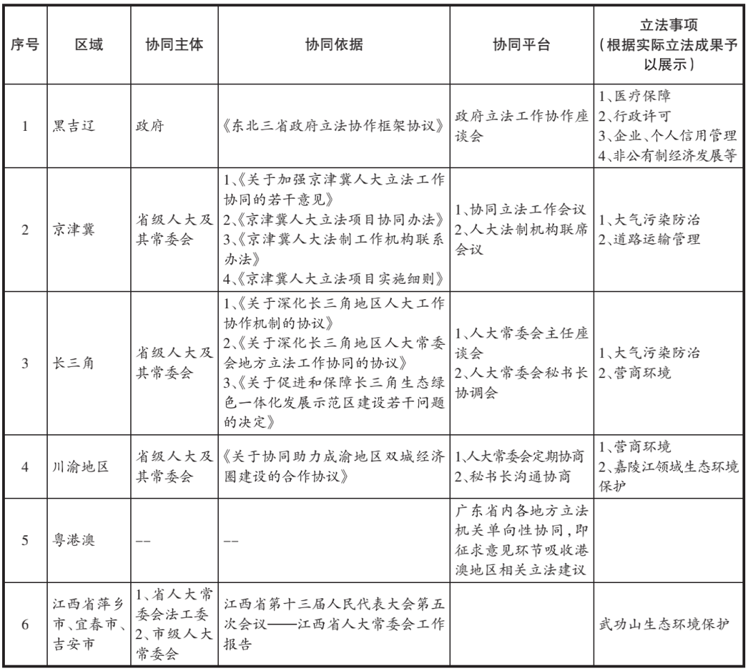 区域协同立法区别于传统地方立法活动的关键点在于地方立法主体在立法过程中打破了行政区划的界限,针对社会的立法需求,从前期的调研到立法项目、立法内容的确定,再到法规的审议节奏,实现了信息上的互通和立法节奏上的同步,成为解决跨区域性问题的重要立法实践。总结来说,区域协同立法活动中,立法主体是各地方的立法机关,主要的协同阶段出现在中期立法内容的讨论上,在基本立法内容成型之后分别由各地方的立法主体通过相应的立法程序完成对法规的出台和公示。这一过程的实质是地方在横向关系上的拓展和创新,实现了由各自独立、相互竞争向合作交流、协同发展状态的转变。