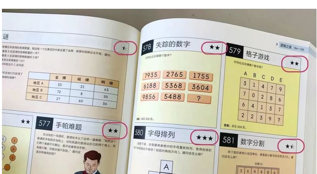 全书近3000道谜题,难度是不一样的,为了让大家更好地使用,每道题都标注了星级,做出了难度区分: