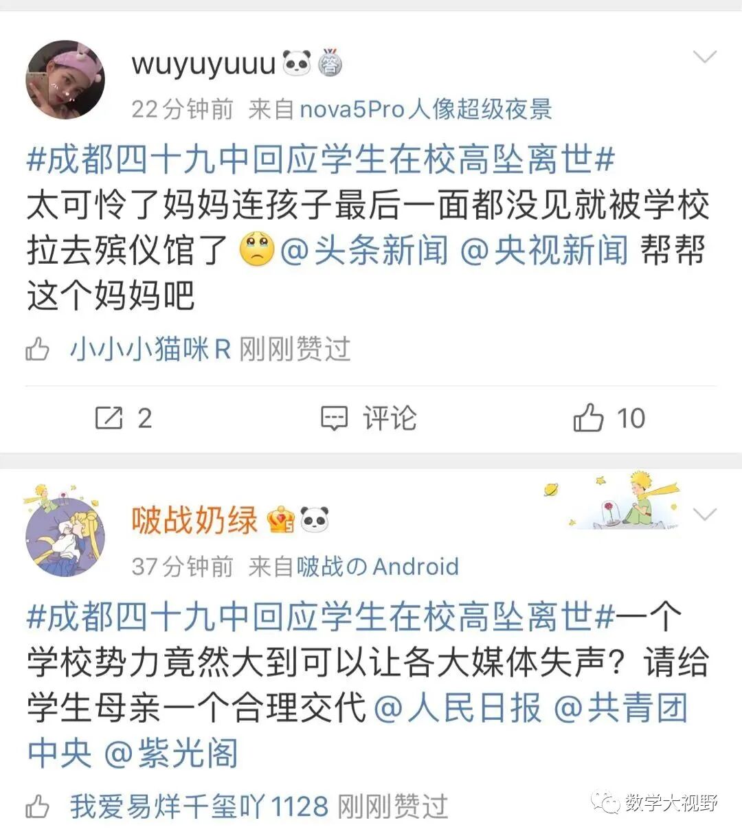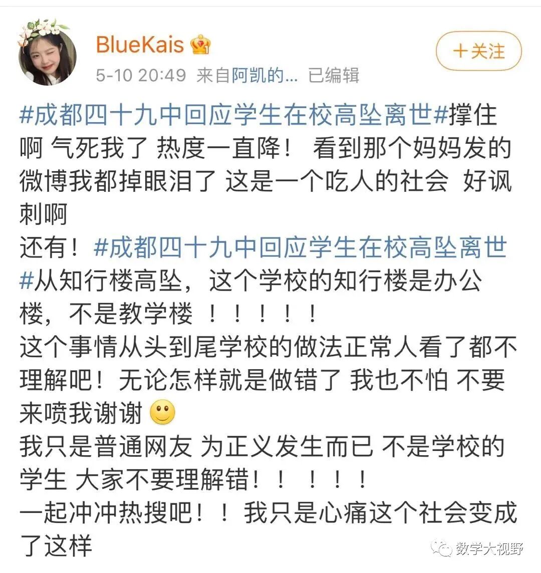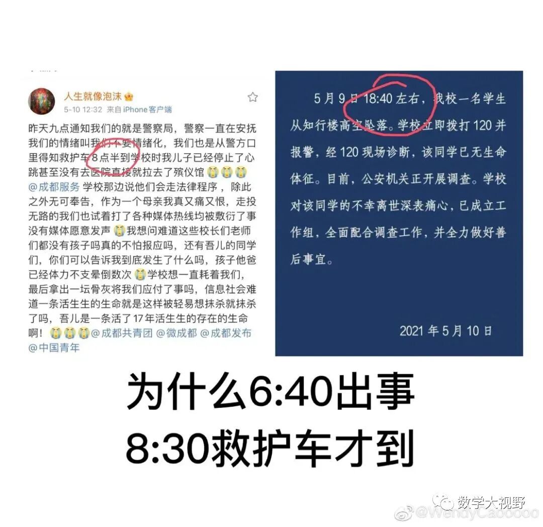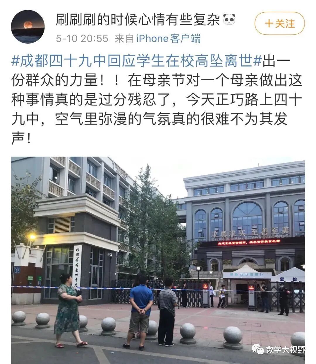 今晨6:35,网友“人生就象泡沫”开始在网络发布信息,讲述其于5月9日接到成都第四十九中学校发来的信息,表示其孩子因从楼道坠落身亡,但学校拒绝家长进入学校并不提供监控等信息,引起高度关注。