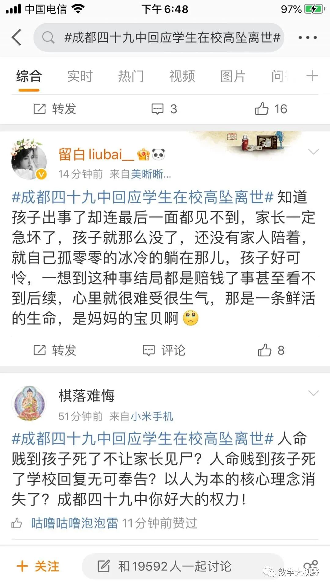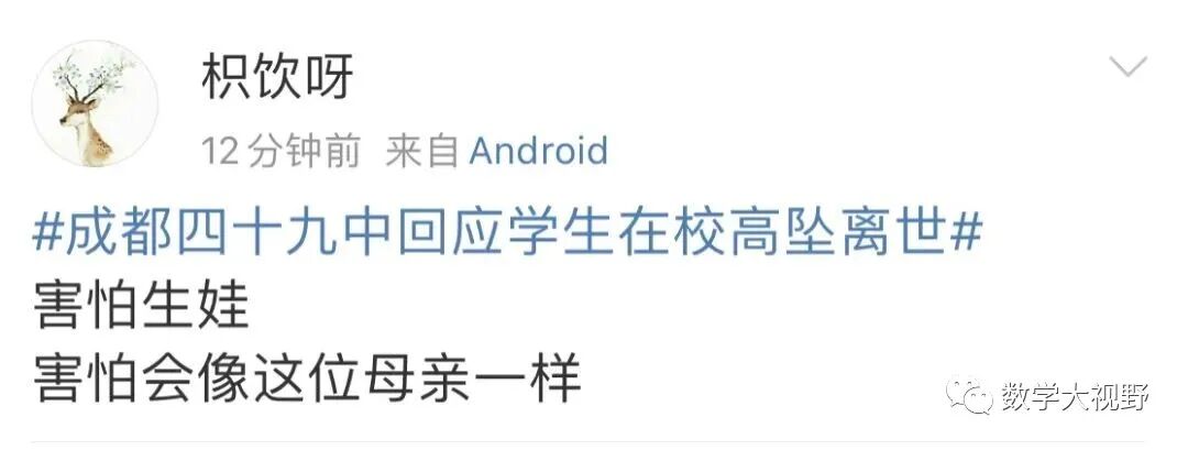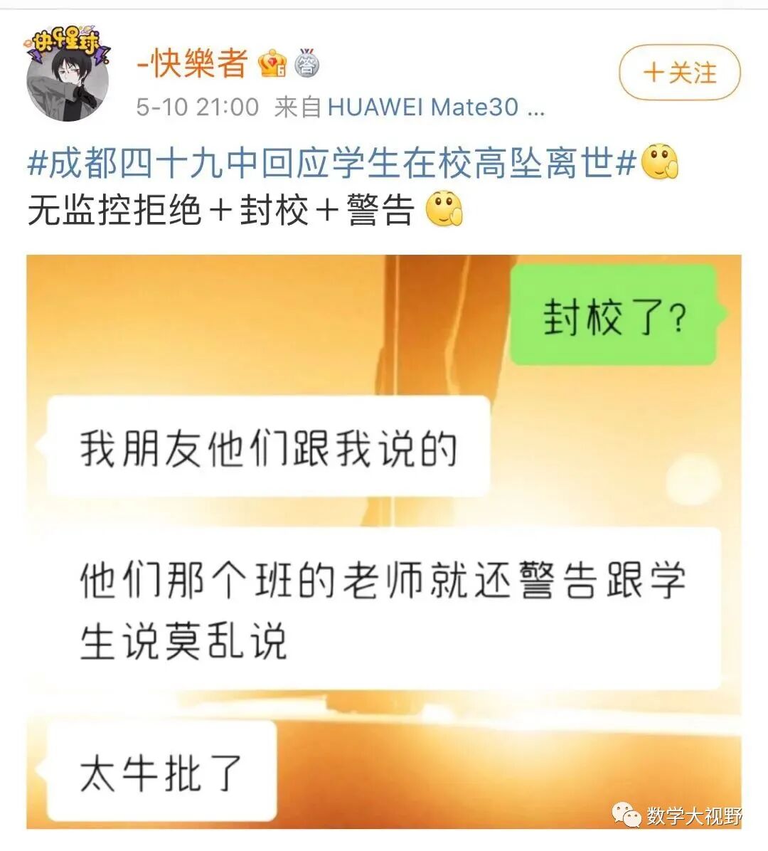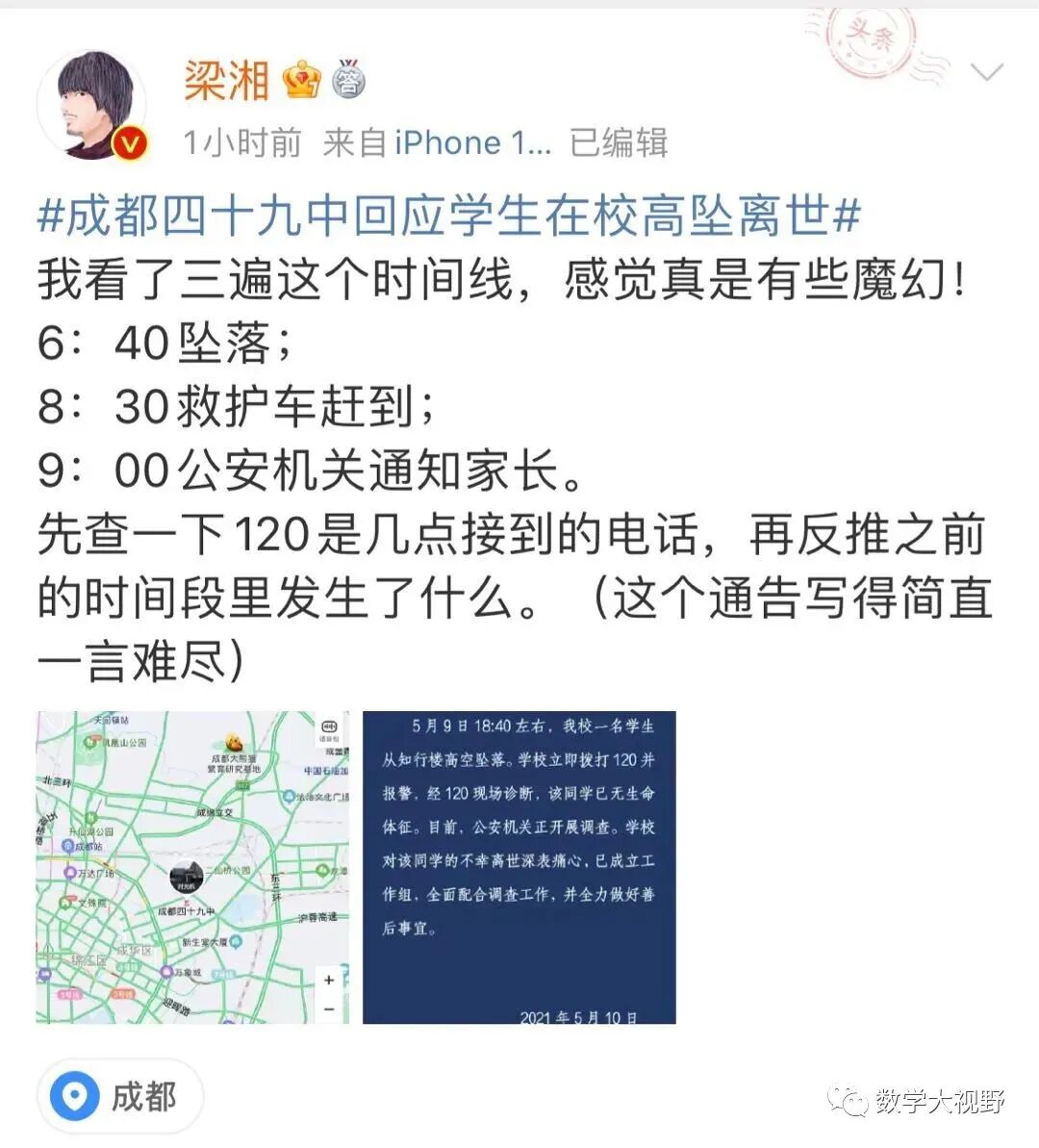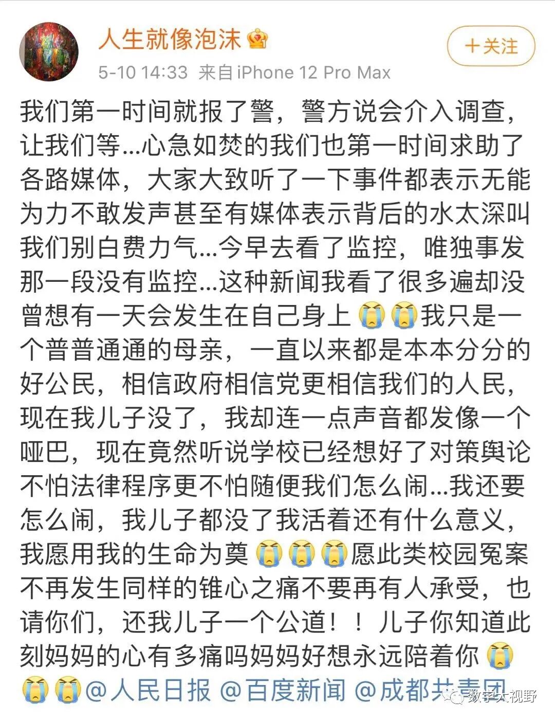 今晨6:35,网友“人生就象泡沫”开始在网络发布信息,讲述其于5月9日接到成都第四十九中学校发来的信息,表示其孩子因从楼道坠落身亡,但学校拒绝家长进入学校并不提供监控等信息,引起高度关注。