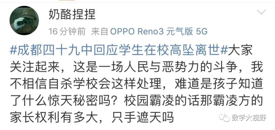 网友们更气愤了,有人认为学校施压是在毁掉学生,有人追问为何学生会在学校的办公楼坠亡?还有人怀疑是否存在校园霸凌?