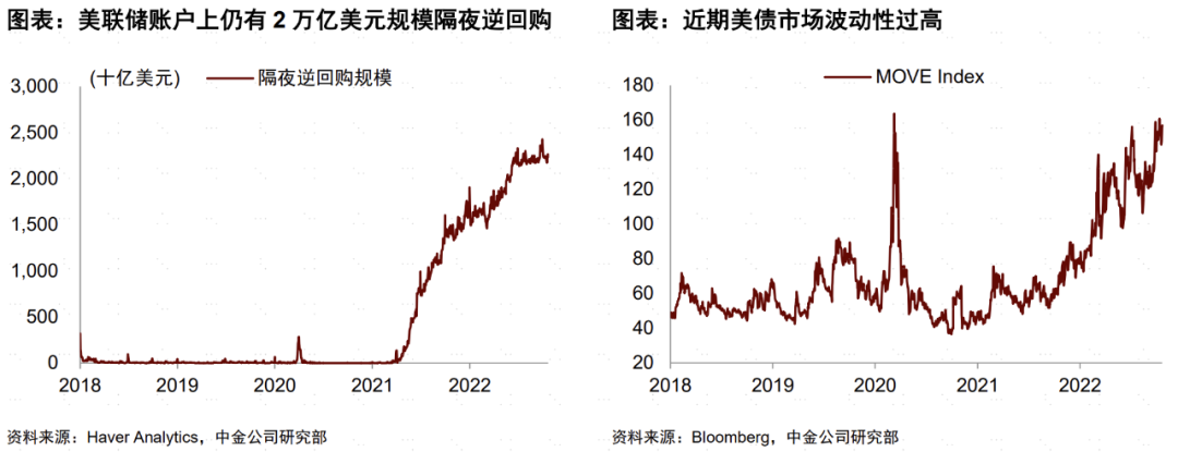 10月份以前,大部分的非线性事件都推高美债利率,现在可能有一类非线性事件——金融市场风险——成为压低美债利率的力量。美联储可以选择牺牲经济增长控制通胀,但是可能无法接受金融市场紊乱与金融危机。本次加息周期速度快于历史上大部分加息周期,但当前金融市场的复杂程度远远超过几十年以前,一些机构与市场可能难以适应突如其来的高利率环境。以英国危机为例,在英债崩盘后,暴露了养老金LDI投资的杠杆率问题,英国央行也被迫选择以“暂时性QE”的形势稳定市场。我们认为其他国家的市场可能隐藏类似的问题,金融市场震荡后政策应对也可能接近英国央行的选择。目前除美债市场运行已经暴露问题以外,我们认为发达市场高收益公司债与新兴市场主权债的风险积累也不容忽视。事实上,近期华尔街日报报道联储官员已经开始关注“紧缩过度”风险,并有可能在12月美联储会议上放慢加息速度。尽管并非基准情景,但我们认为需要考虑美联储2023年提前调整加息与缩表政策的可能性。美债利率2023年可能继续宽幅震荡,但最终下行幅度可能超出预期。![]()