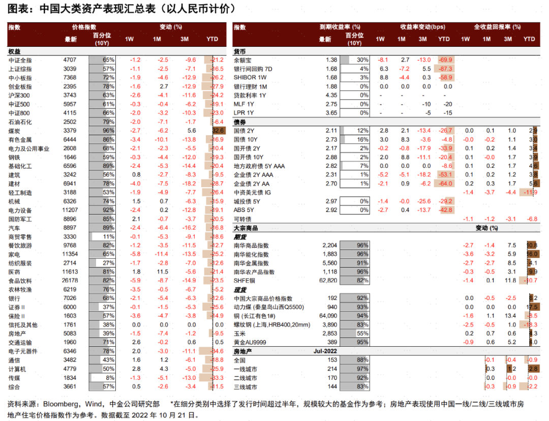 过去一周,全球大类资产表现相对排序为美股>黄金>中国债券>全球债券>美元>大宗商品>港股>A股。海外方面,上周四晚美国公布的9月通胀数据再超预期,叠加美联储官员鹰派表态,市场预期美联储加息终点提高至5%附近,降息预期也相应推后,受此影响美债利率上行突破4.3%,美元指数最高逼近114,黄金周内跌幅一度扩大至-3.7%,美股则因三季度业绩期和外围环境改善得到一定支撑;本周五市场开始讨论联储放缓加息速度,各类资产表现出现一定程度反转,美股继续上涨,周内累计上涨幅度高达4.8%,领跑全球大类资产,黄金表现也明显提振。国内方面,重要会议报告提出中国式现代化的内涵[1],重申发展是第一要务,着力点是实体经济,强调创新、绿色、协调,对当前社会各界关注问题给出明确回应,有助于稳定市场预期,周内A股也迎来“定向降息”[2],但受外部复杂环境和国内疫情影响,A股周内表现低迷,累计下跌3%,国债利率小幅走高,人民币汇率继续承压。近期风险事件:国内关注9月工业企业利润数据(10月27日)和10月官方PMI数据(10月31日);海外关注美国/欧洲三季度GDP数据(10月27日/10月31日)和欧洲央行/日本央行10月利率决议(10月27日/10月28日)。![]()