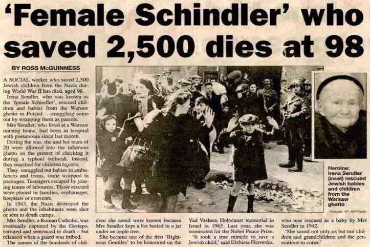 艾琳娜·森德勒(Irena Sendler)——波兰的“女辛德勒”,曾冒死从纳粹手中救下2500多名犹太儿童。2006年7月30日,96岁高龄的艾琳娜在德国慕尼黑举行的纪念仪式上接受荣誉勋章。2008年5月12日,艾琳娜在波兰逝世,享年98岁。