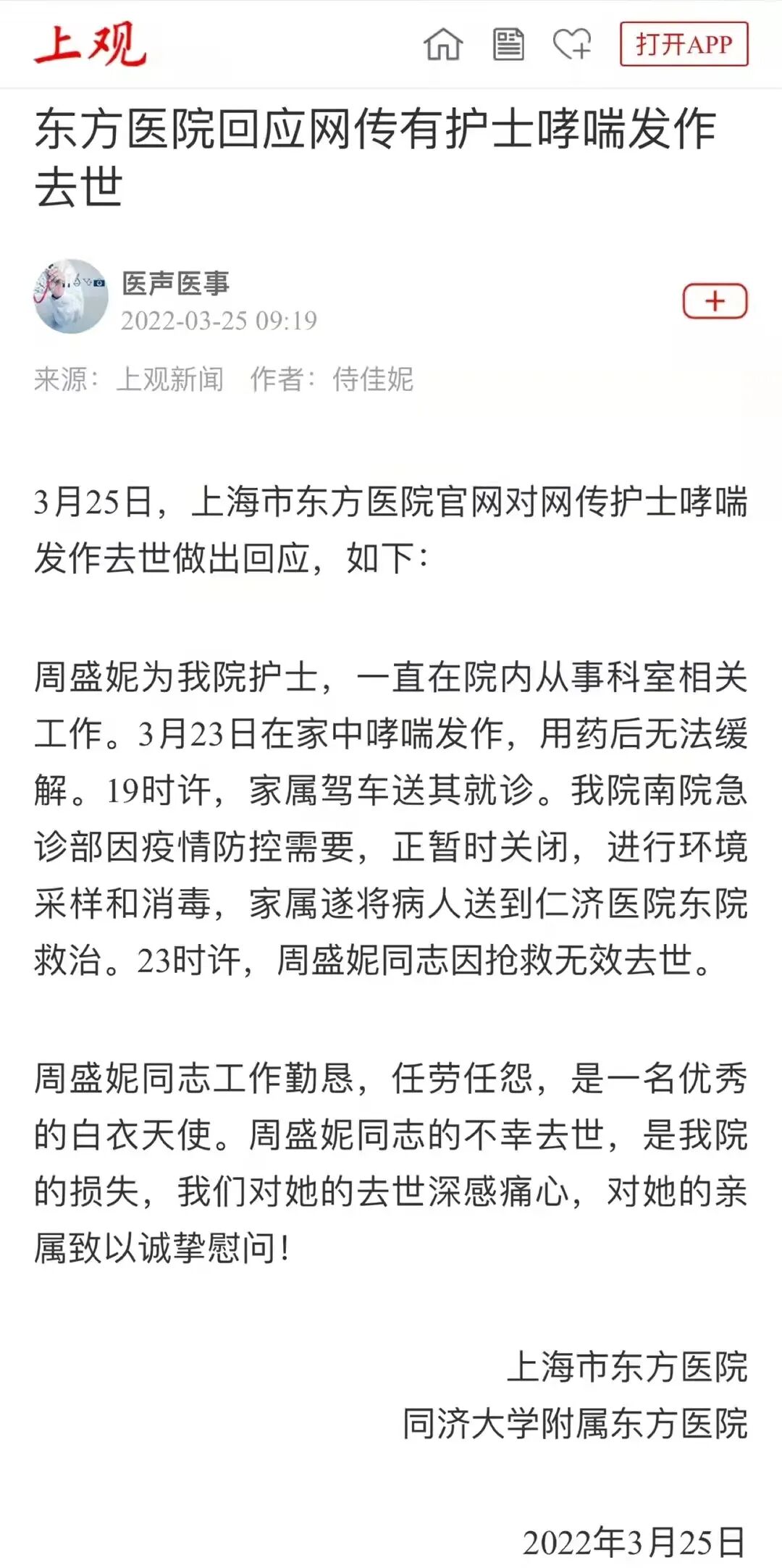 昨晚看到网友说上海有位护士可能比较危险,今早证实是东方医院护士周盛妮女士在家因哮喘发作,自用药无效,120无果,家属驾车求医,因防疫要求被数家医院拒绝,包括自己工作了30年的医院,最后在仁济医院东院抢救无效去世。
