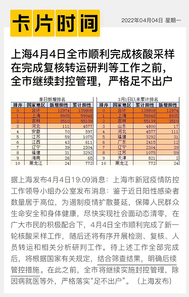 还有很多的次生灾难出现,有一些不能证实或证伪,但一篇《上海疫情中,一位清华校友的非正常死亡》还是让我非常悲伤。在上海,“由于上海医院疫情管控、医护失误,导致女儿(李昶)意外离世。使尚未成年的儿童和少年失去了母亲;丈夫失去了妻子;年迈的父母陷入白发人送黑发人的境遇。”确实,目前为止,上海的奥密克戎病毒感染者还没有一例重症或危重症患者,更没有一例死亡病例,但次生灾害已经造成多少的伤害?