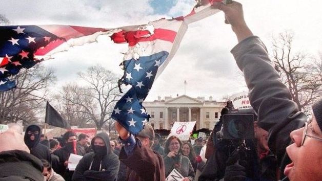 反战人士屡屡焚烧星条旗宣泄,为此国会1968年通过法案——“凡故意在公众场合毁坏、污损、焚烧或践踏美利坚合众国国旗者,罚款不超过一千元,或入狱不超过一年,严重者两者并罚。”