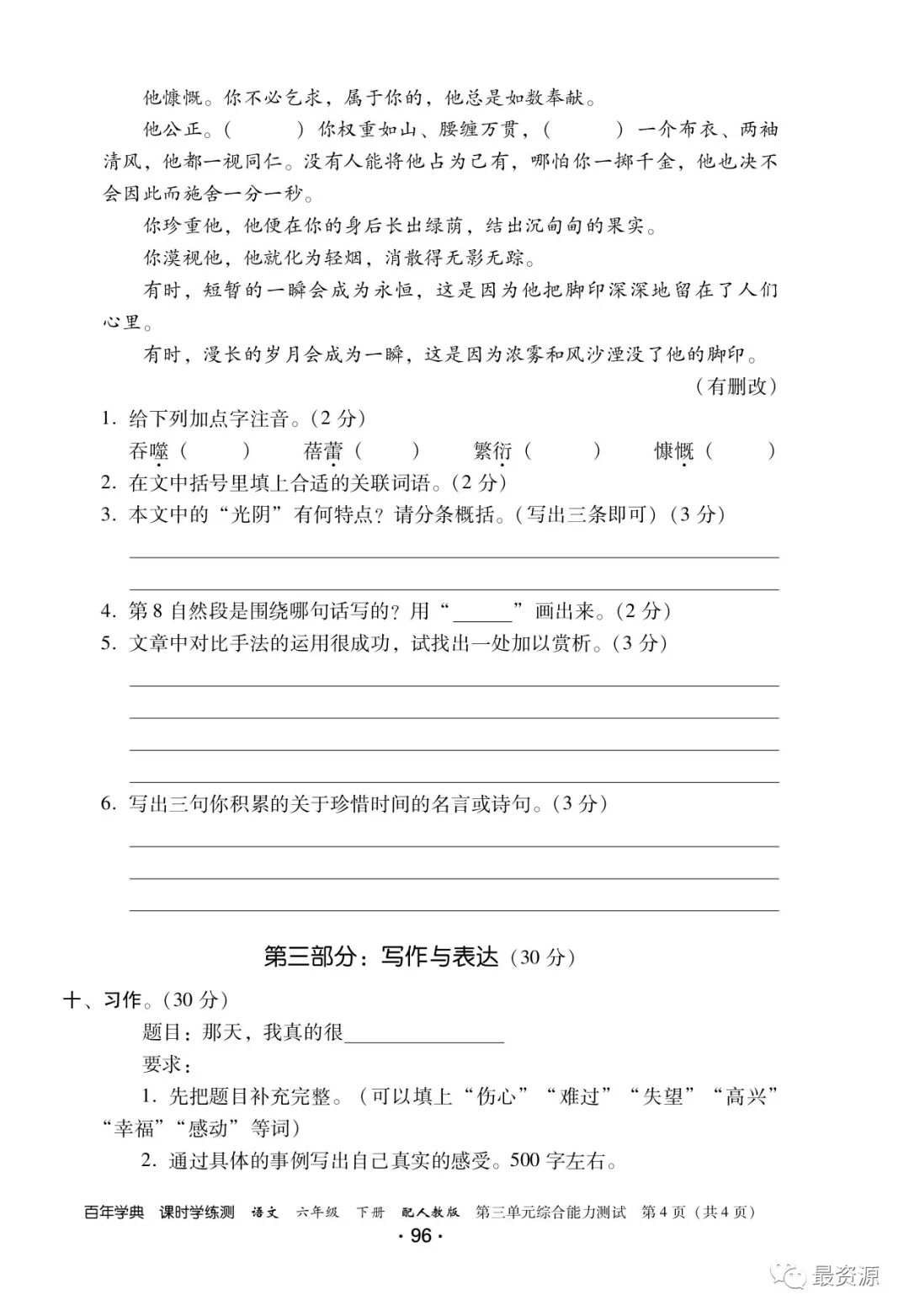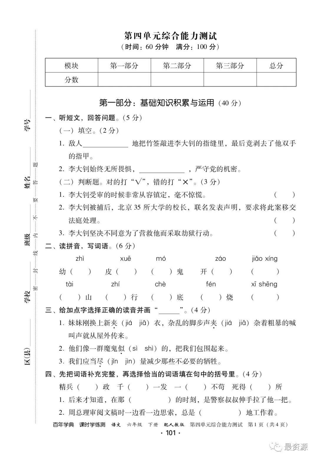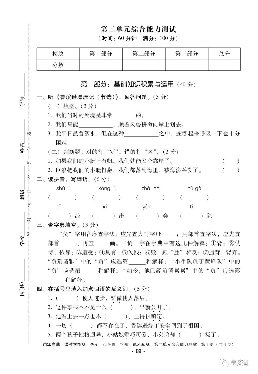 6年级下册《课时学练测》1-6单元+专项训练