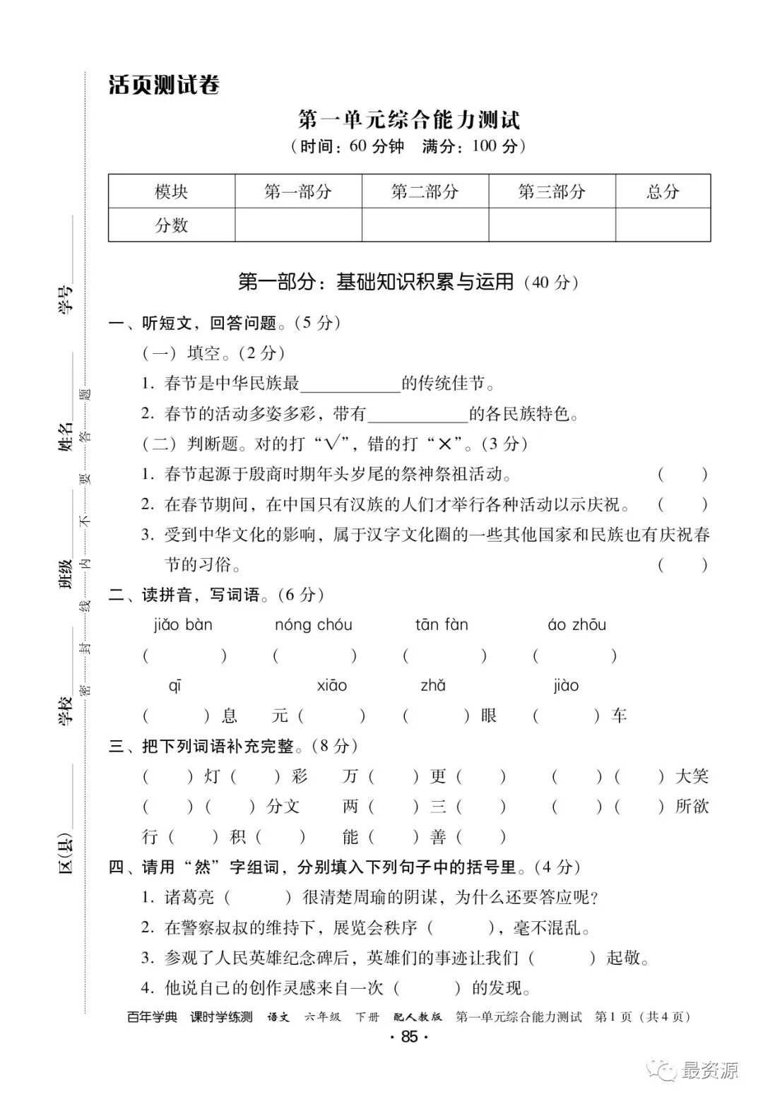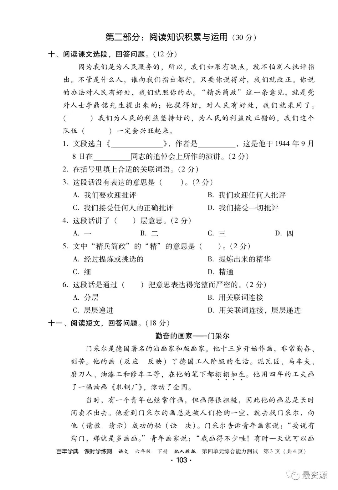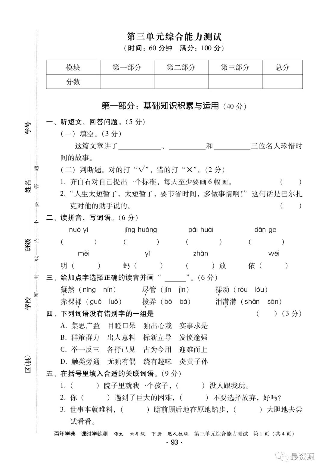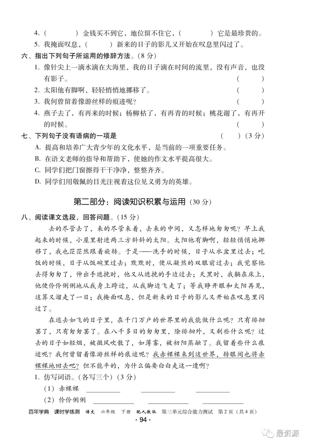 6年级下册《课时学练测》1-6单元+专项训练