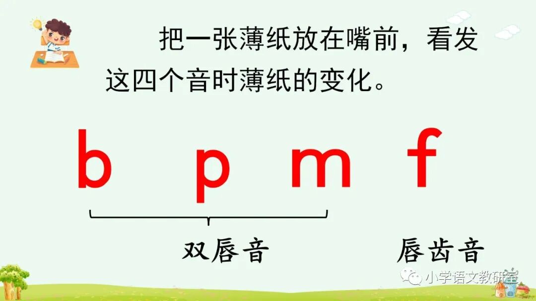 b p m 的发音部位是上下唇,叫双唇音。f 的发音部位是上齿和下唇,叫唇齿音。
