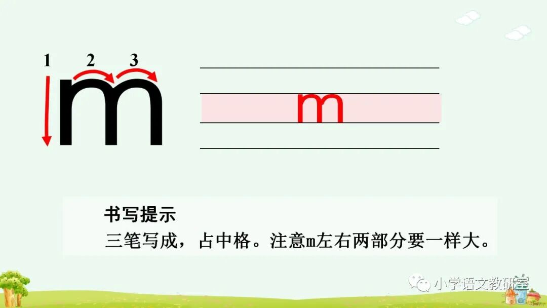 m占中格,先写一竖,再写两个左弯竖,三笔写成。