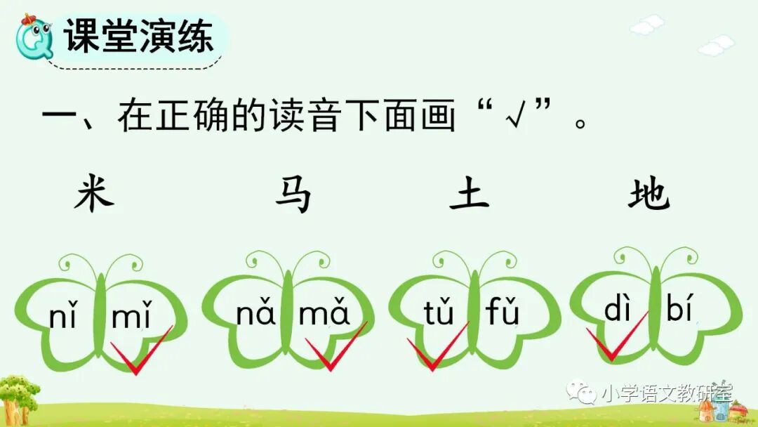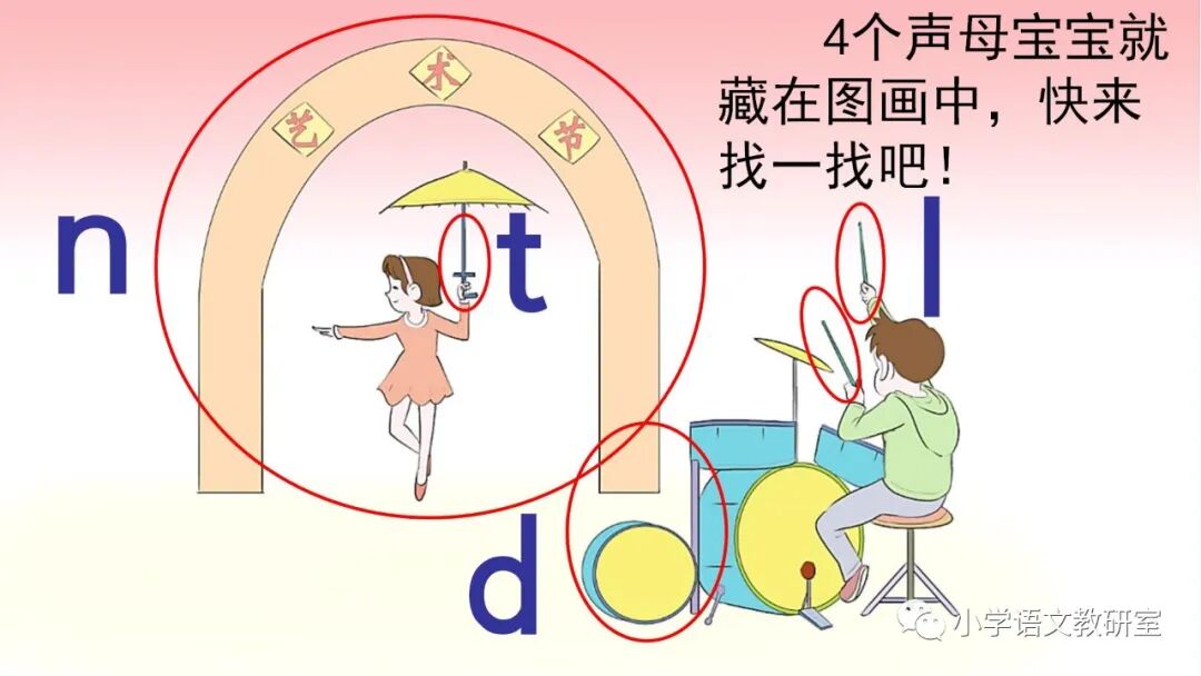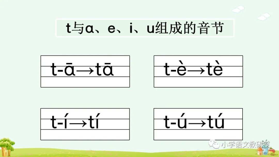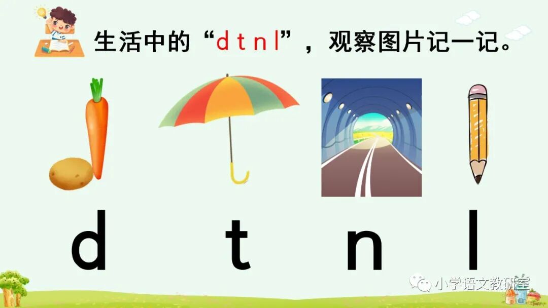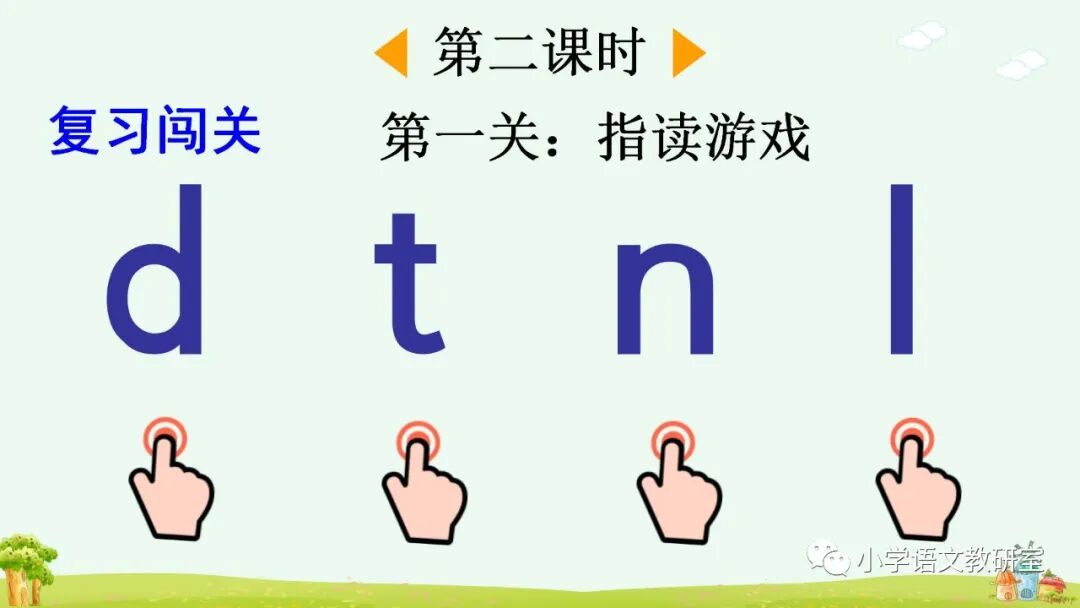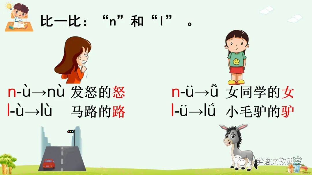 声母 d、t、n、l和单韵母拼读音节,可以调用学生已有的生活经验直接切入音节进行拼读。如,让学生说说自己熟悉的事物中有没有带 ti、di、tu、ni、li……这些读音的,借助有关汉字的读音练习拼读音节。然后引导学生自己熟练拼音,并把自己会拼读的音节读给同学听。教学时,要注意采用对比的方法分辨 n、l 与同一韵母拼读成音的细微差别。最后通过带调拼读,联系口语帮助学生分辨、记忆,如,n—ù→nù 是发怒的“怒”,l—ù→lù 是马路的“路”;n—ǚ→nǚ 是女同学的“女”,l—ǚ→lǚ 是旅游的“旅”。