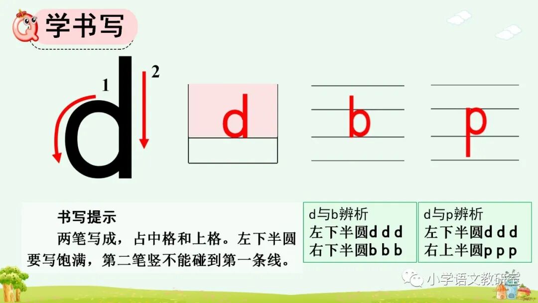 d占上中格,先写左下半圆,再写一竖,竖出第二线,第二笔竖不能碰到第一条线,两笔写成。