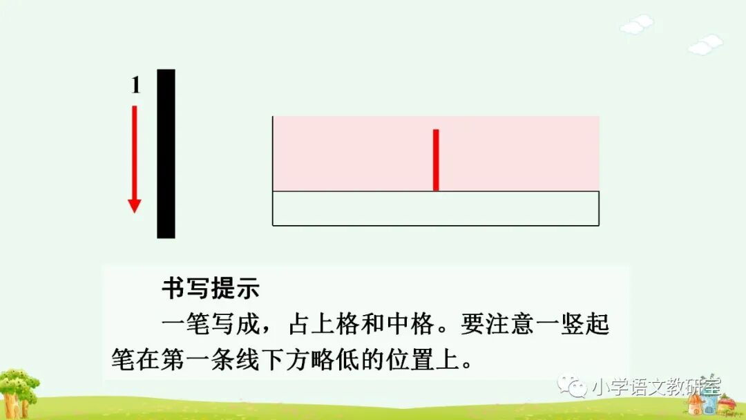 l 占上中格,竖要写直,书写时要注意一竖起笔在第一条线下方略低的位置上,一笔写成。