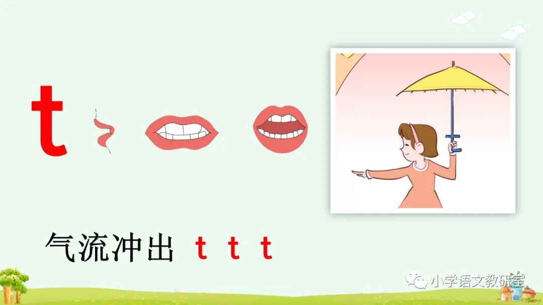 发 t 时,发音部位、方法和d基本相同,不同的是口腔送出的气流比较强。