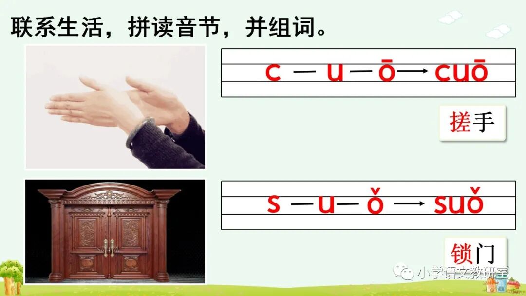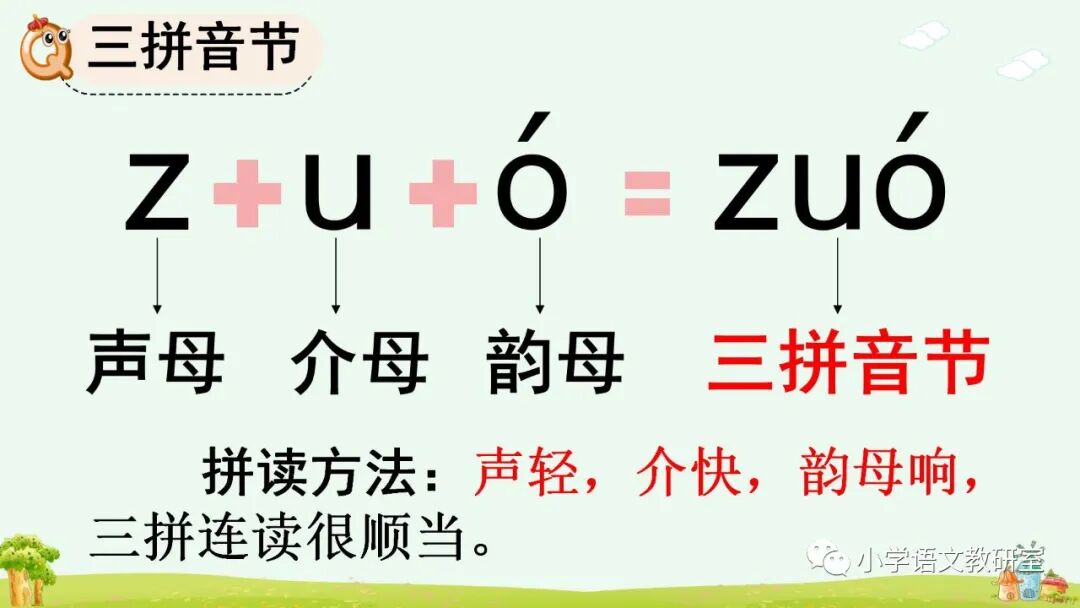 2.三拼音节:声轻介快韵母响,三音连读很顺当。
