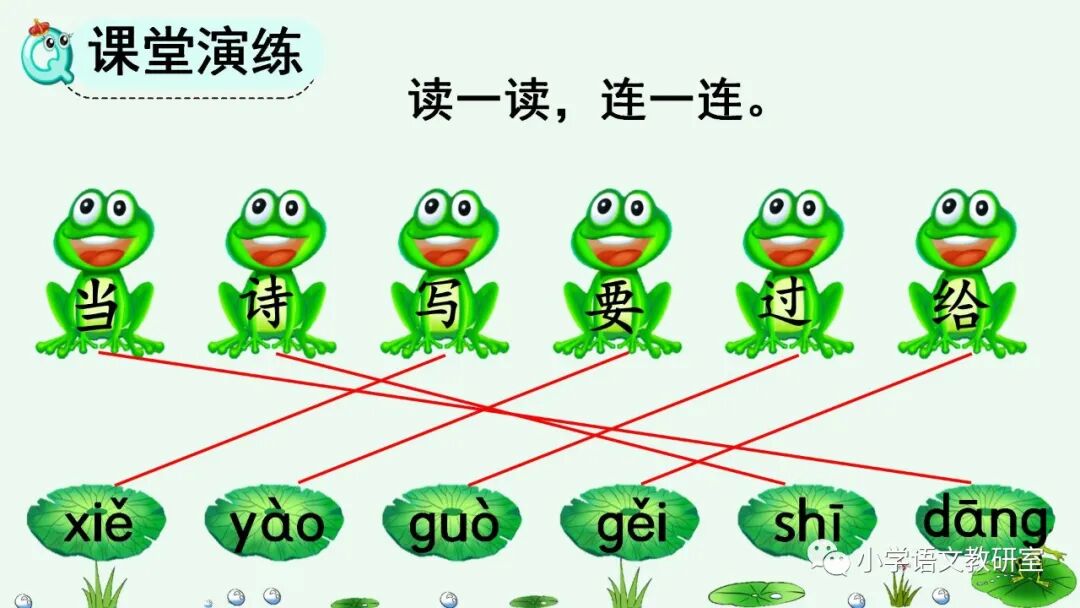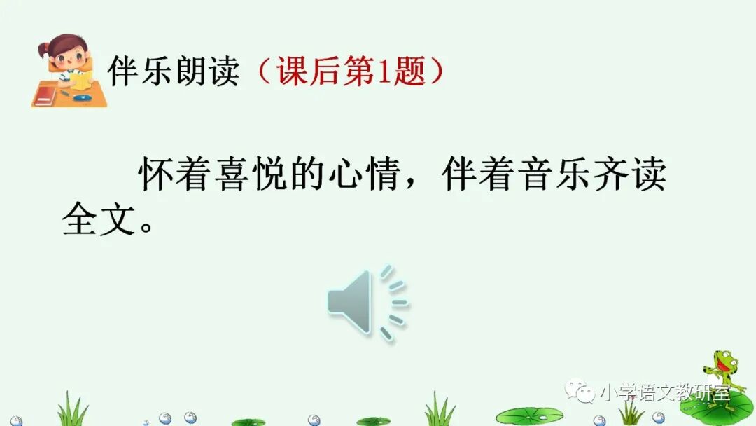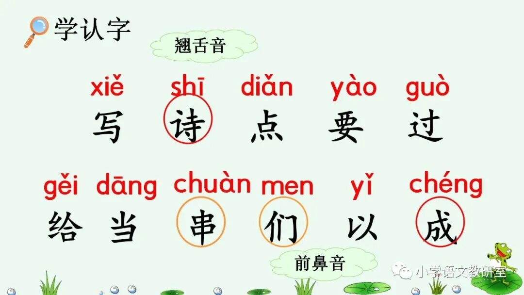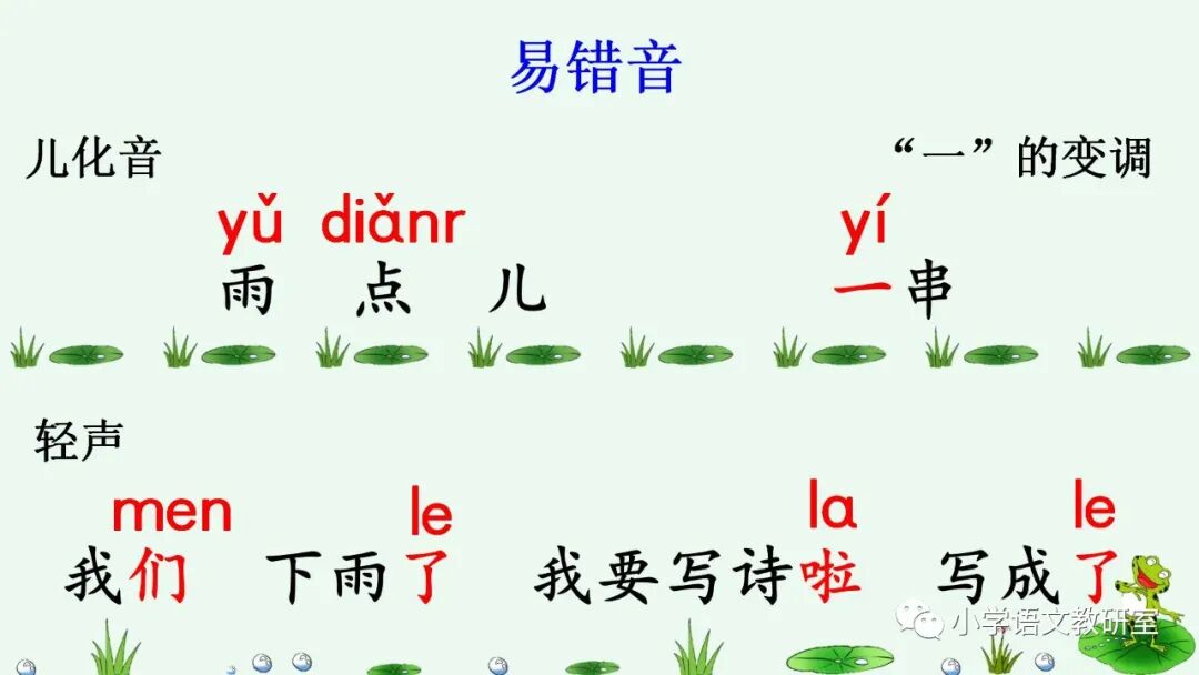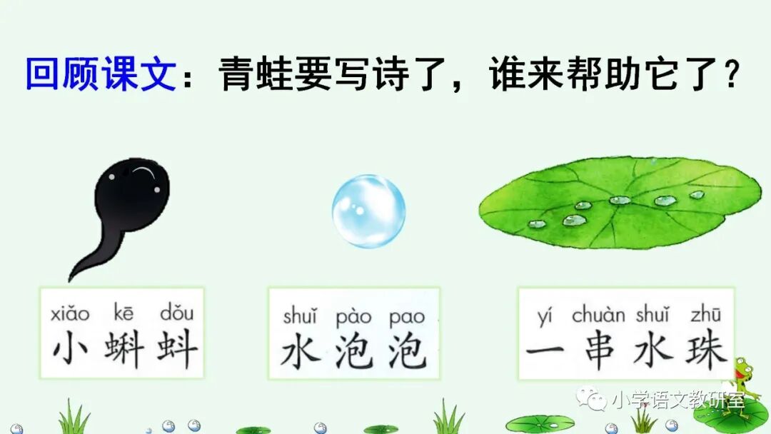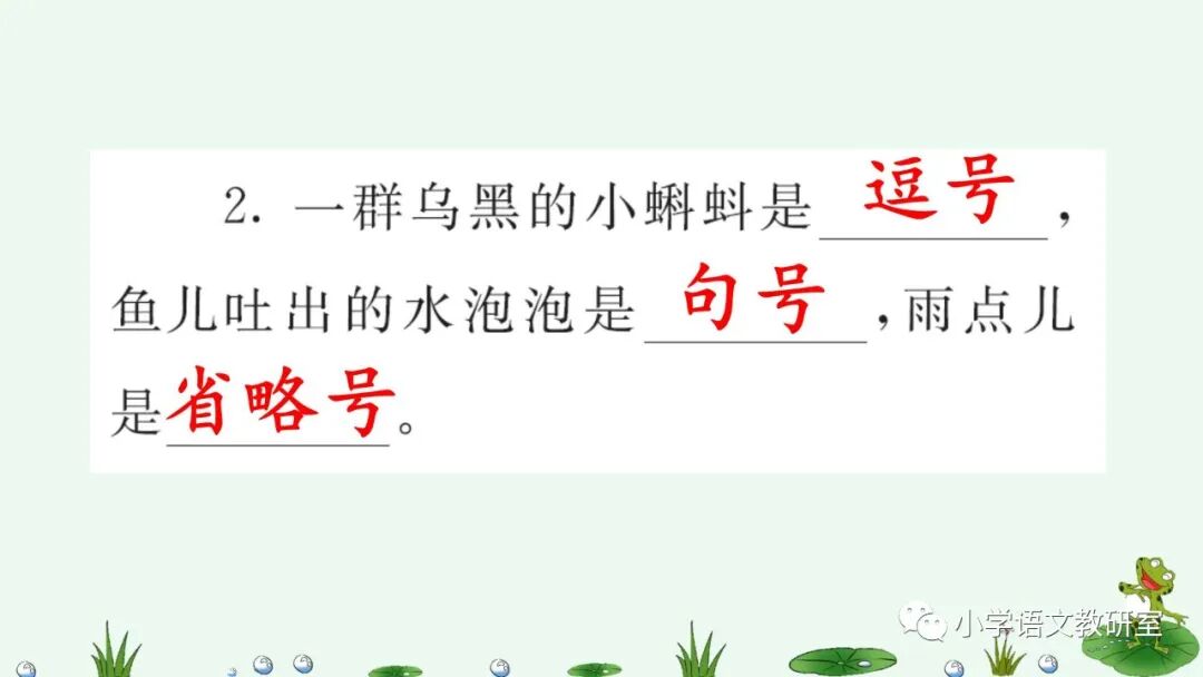 课文生动地描绘了青蛙在下雨天“呱呱呱”叫着写诗的情景。我们从中直观地认识了逗号、句号、省略号的写法。