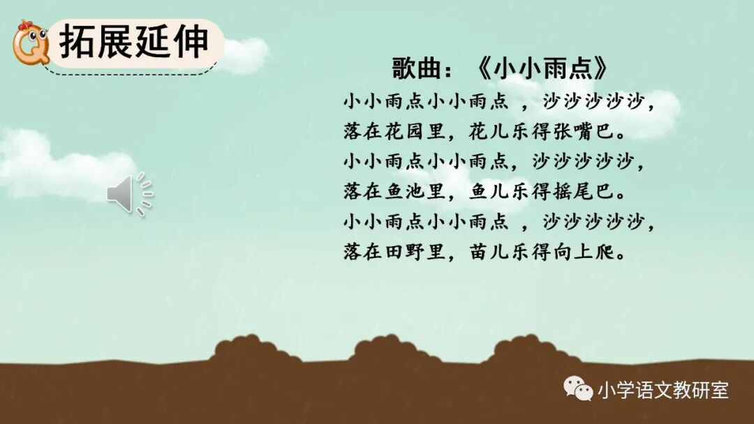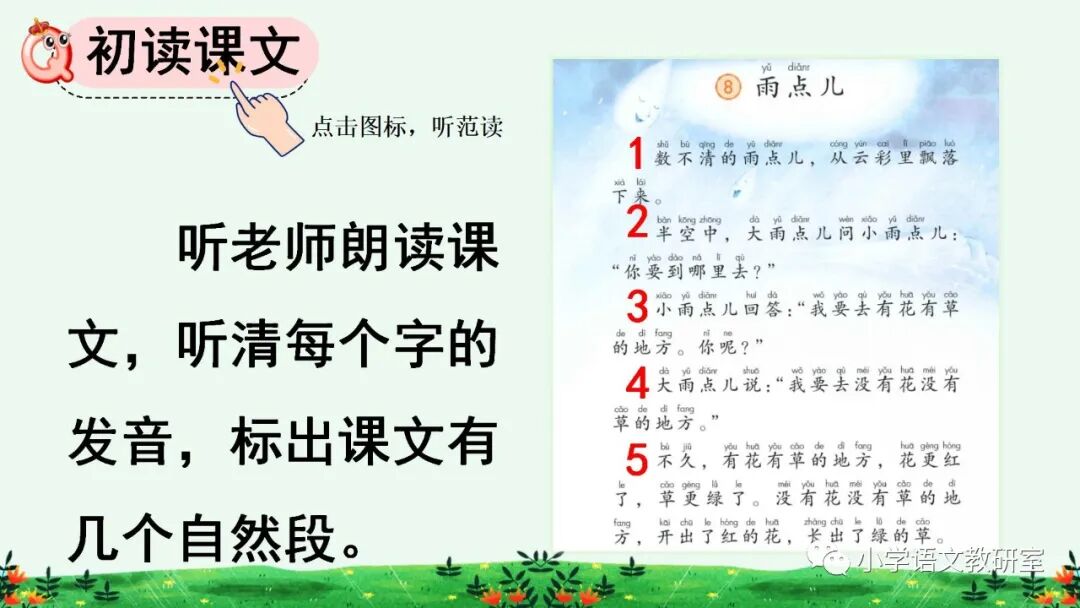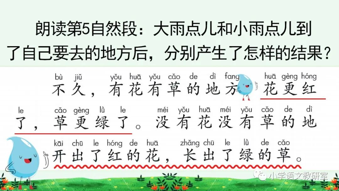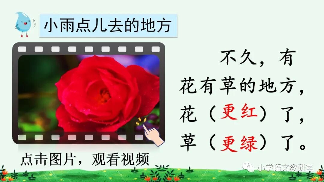 本课是篇科学童话。课文用拟人化的手法,通过大雨点儿和小雨点儿的对话,告诉我们雨点儿是从云彩里飘落下来的,有了雨水的滋润,花更红了,草更绿了,说明了雨水和植物生长有着密切的关系。