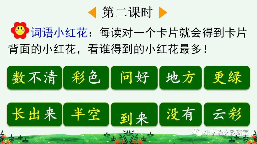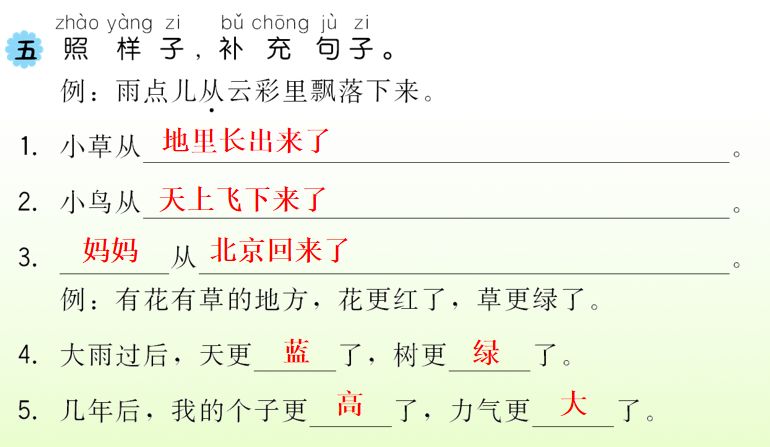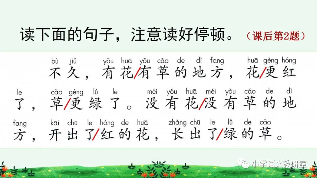 不 久,有 花/有 草 的 地 方,花/ 更 红 了,草/更 绿 了。没 有 花/没 有 草 的 地方,开 出了/红 的 花, 长 出 了/绿的草。