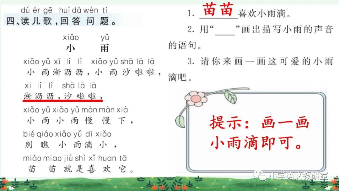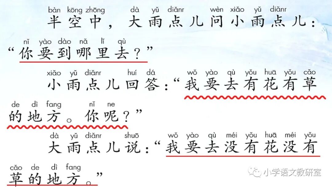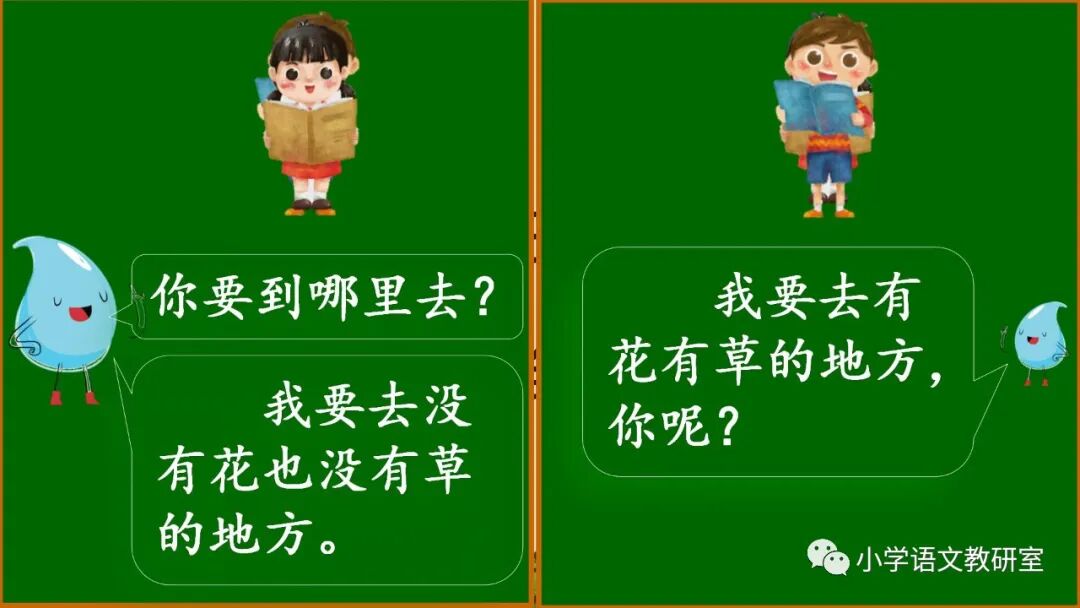 1.小雨点儿回答:“我要去有花有草的地方。你呢?”大雨点儿说:“我要去没有花没有草的地方。”你觉得谁的选择好?为什么?