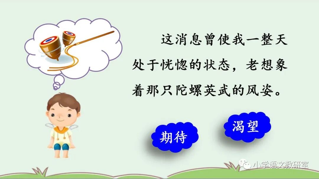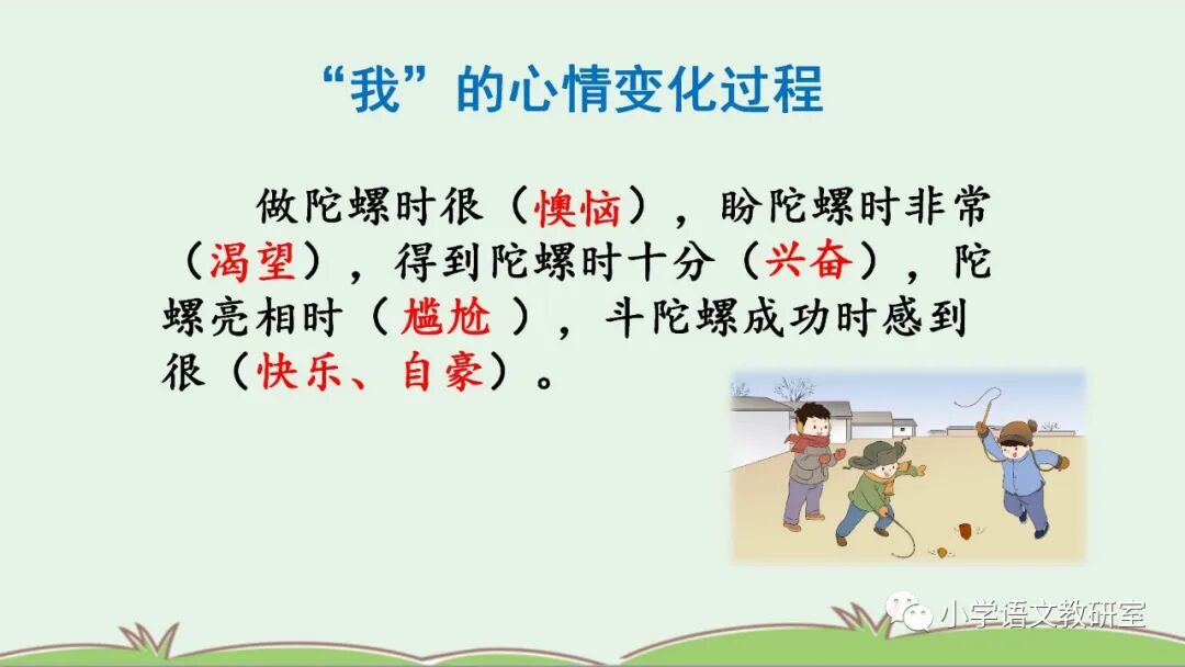 1、朗读课文,找出作者说陀螺的段落,仔细读一读,思考:作者在说陀螺的时候,心情是怎样的?