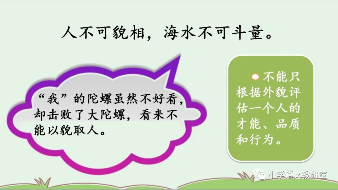 比喻不能只根据相貌、外表判断一个人,如同海水是不可以用斗去度量一样,不可根据某人的相貌就低估其未来。“我”的陀螺虽小,但机智、灵活,使自己立于不败之地。 所以说不能只根据外貌评估一个人的才能、品质和行为。