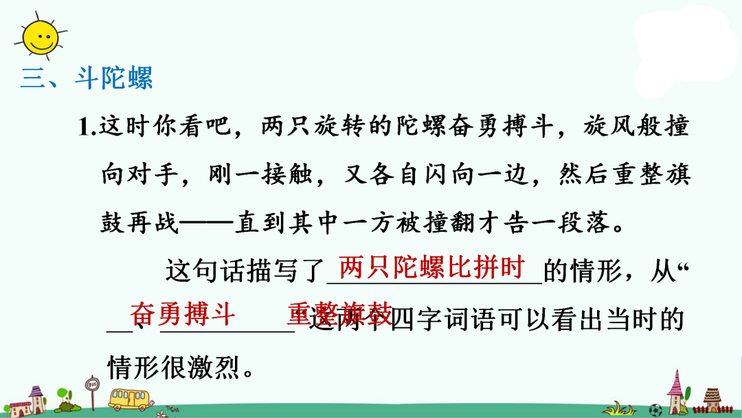 (1)因此,曾有很长一段时间我的世界堆满乌云,快乐像过冬的燕子一般,飞到一个谁也看不到的地方去了。(为没有高质量的陀螺而懊恼,不高兴。)