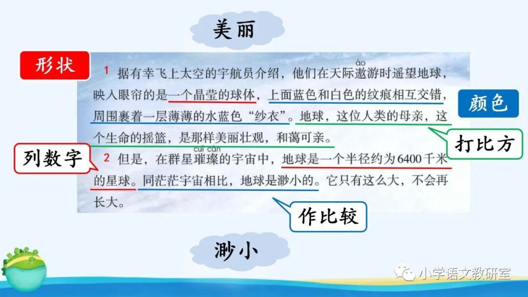 3.地球是一个半径只有六千三百多千米的星球。( )4.科学家们提出来许多设想,例如,在火星或者月球上建造移民基地。据有幸飞上太空的宇航员介绍,他们在天际遨游时遥望地球,映( )入眼帘的是一个晶莹透亮的球体,上面蓝色和白色的纹痕( )相互交错,周围裹着一层薄薄的水蓝色“纱衣”。地球,这位人类的母亲,这个生命的摇篮,是那样的美丽壮观,和蔼可亲。1.这段文字写的是____________________。 4.根据理解完成填空。(1)“蓝色和白色的纹痕相互交错,周围裹着 一层薄薄的水蓝色‘纱衣’”中“蓝色”的是__________,“白色”的是__________,“水蓝色的纱衣”指的是__________(2)这段话中将地球比作__________和__________,说明它的__________,表达出对地球的 二、 1.宇航员在太空看到的地球的样子 2.yìnɡ hén 3.映入眼帘的是一个晶莹透亮的球体,上面蓝色和白色的纹痕相互交错,周围裹着一层薄薄的水蓝色“纱衣”。▍免责声明:所有图文、音视频仅供学习交流使用,版权归原作者所有,除非无法确认,我们都会标明作者及出处,如有侵权烦请告知,我们会立即删除并表示歉意。商务合作微信:lhp6966