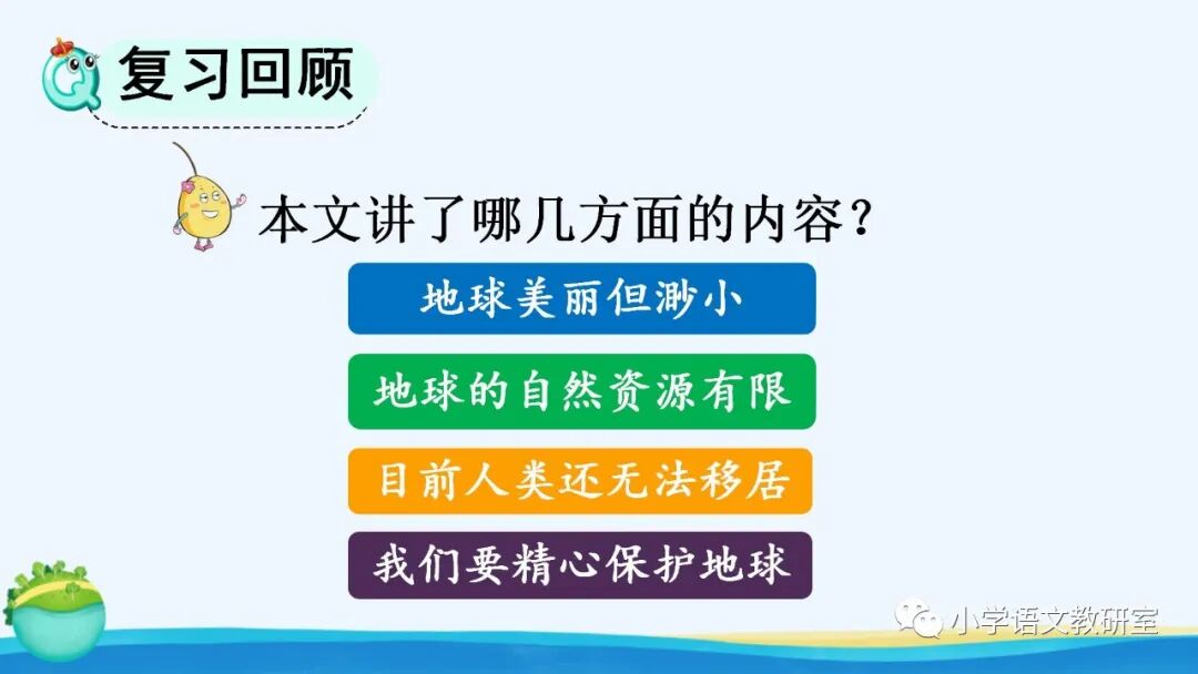 课文先从宇航员在太空遥望地球所看到的景象写起,引出了对地球的介绍;接着从地球在宇宙中渺小、地球所拥有的自然资源有限而又被不加节制地开采和随意毁坏等方面,说明地球面临着资源枯竭的威胁;然后用科学家研究的成果证明,当地球资源枯竭时,人类无法移居到第二个适合的星球上;最后告诉人们:人类应该精心保护地球,保护地球的生态环境。