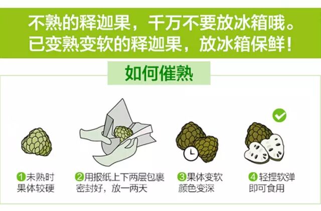 1、如果你在市场上购买回来的释迦看起来还是比较生硬的话,可以用用报纸包裹,喷些水,放上一二天,待变软后即可食用。