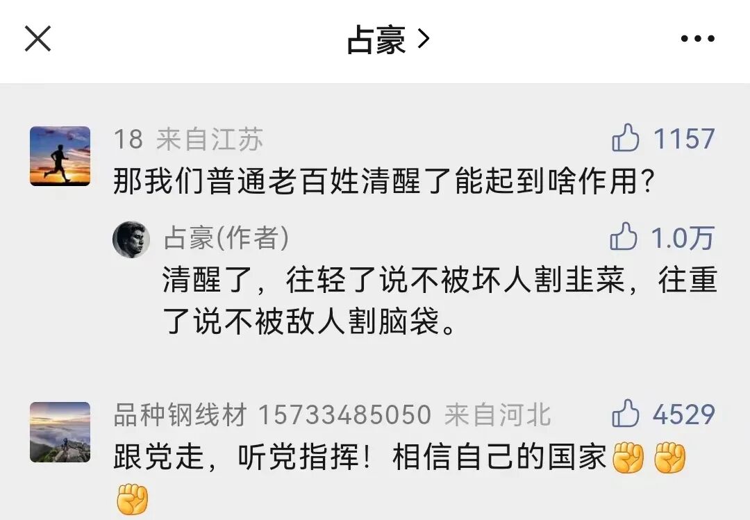 昨天文章《原创丨该清醒了!不止是经济那么简单!》(点击蓝字查阅)战友们反应特别热烈。有位来自江苏的战友提出疑问:那我们普通老百姓清醒了能起到啥作用?占豪回复:清醒了,往轻了说不被坏人割韭菜,往重了说不被敌人割脑袋。下面一条战友评论被大家点赞点上来了,恰好就是上面一问一答的终极答案:跟党走,听党指挥!相信自己的国家!![]()
