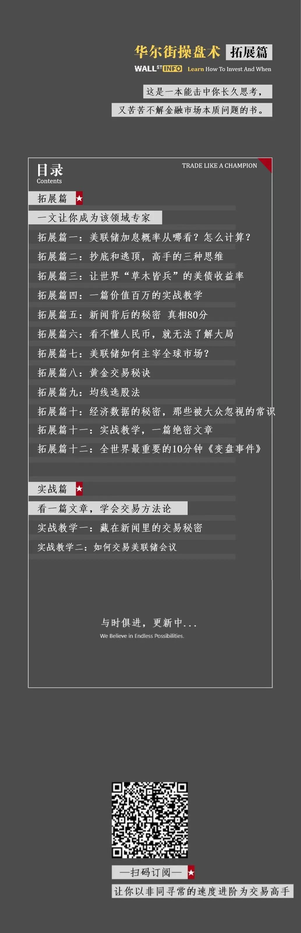 到目前为止,《华尔街操盘术:与大众为敌》已经更新《拓展篇》12篇,《实战篇》2篇。拓展篇的目的是,一文让你成为该领域的专家。而实战篇,则是完全贴近实战的教学,看一篇文章,让你学会交易方法论。