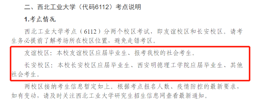 西北工业大学考点分两个校区考试,即友谊校区和长安校区。