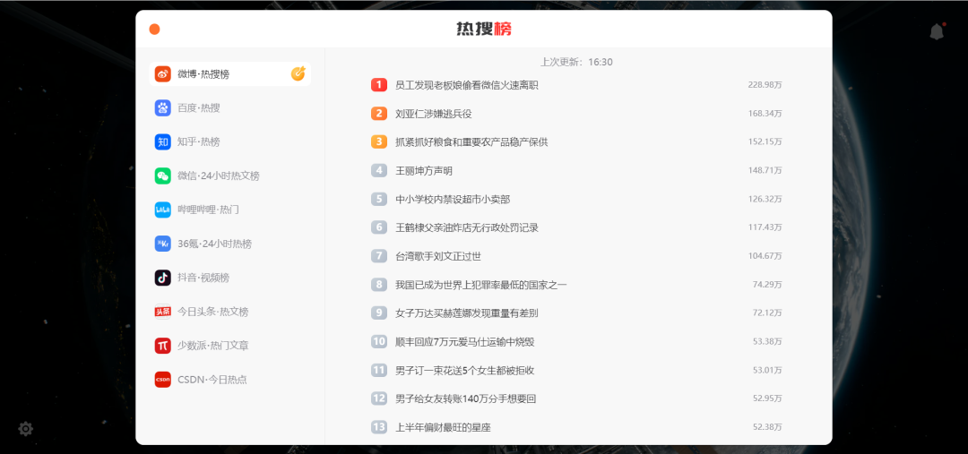 以小组件「热搜」为例,它汇集了全网各大平台的热搜榜单,并会实时更新。