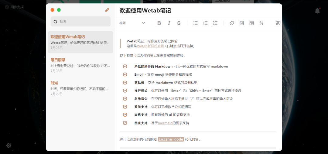 它的编辑器既拥有完整的工具栏,还支持 Markdown 格式、快捷指令、数学公式。其他笔记类软件有的功能,WeTab 的「笔记」小组件几乎都有。