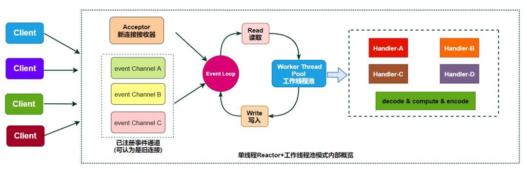 备注:上述例子是以同步IO为例,并且将线程中的角色分为Listen线程、Handler线程、Worker线程,分别完成不同的工作,后续会详细展开。