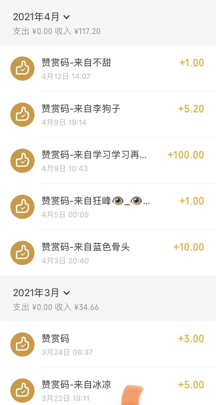 赞赏的金额大小我并不在意,因为我不差这个钱,因此无论收到 100 块的赞赏,还是 1 块的赞赏都是一样开心。