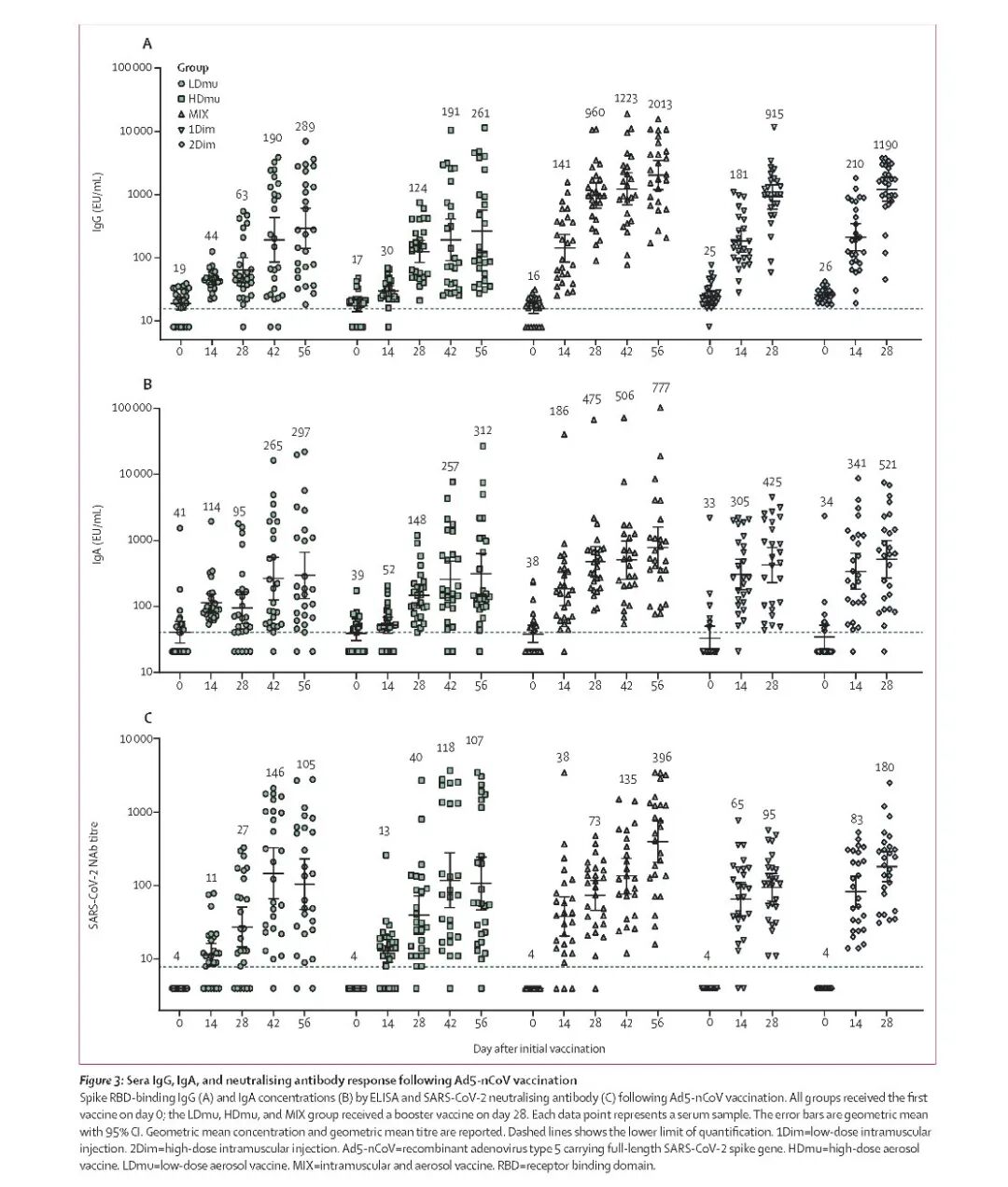 研究检测了血清抗-RBD IgG、IgA抗体以及中和抗体GMT,总结如下表。
