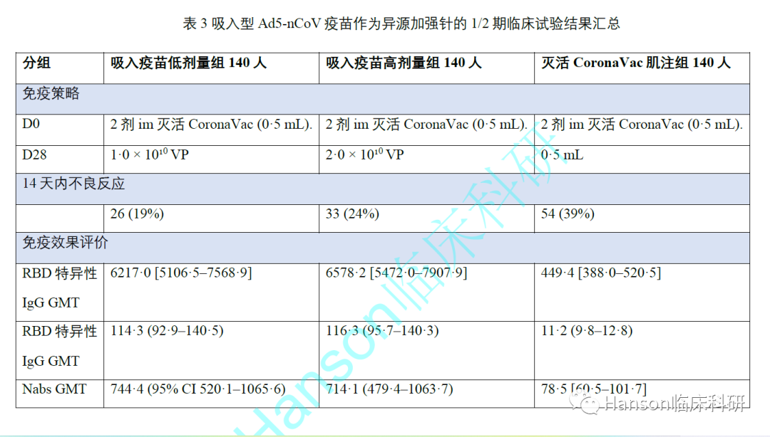 另外一项临床试验(NCT05043259)中研究者将吸入型疫苗作为接种2剂灭活疫苗后的加强针比较了其与灭活疫苗的效果差别【12】,这项研究具有现实意义,为国内接下来的接种策略优化提供了参考和依据。