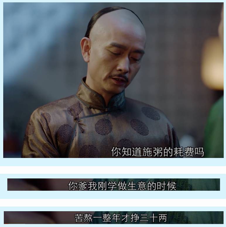 沈老爷辛辛苦苦挣下家业,还没有脱离小商人思维,开口闭口“我第一年做生意的时候,才挣了三十两银子”。