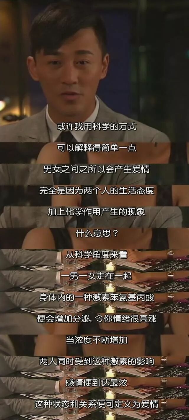 “从科学角度来看,一男一女走在一起,身体内的一种激素苯氨基丙酸便会增加分泌,令你情绪很高涨,产生一种喜悦的感觉,当浓度不断增加,两人同时受到这种激素影响,感情便到达最浓,这种状态和关系便可定义为爱情,我知道我现时正被这种苯氨基丙酸深深影响着,我希望你像我一样。 ”