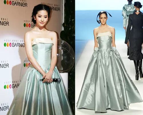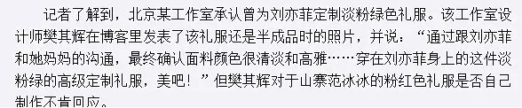 刘亦菲的确穿过山寨礼服,而且两件都出自樊其辉工作室。樊其辉有个外号叫山寨礼服制造“女王”。