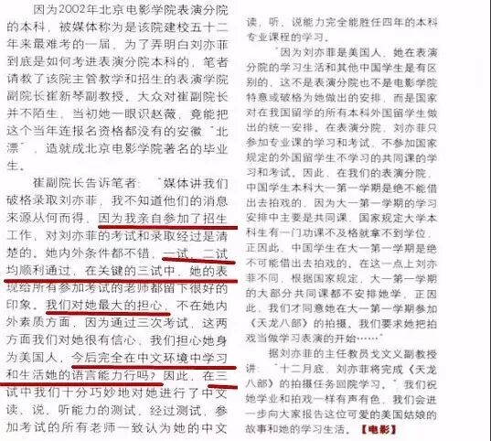 表演学院副院长崔新琴接受采访时提到,在三试中十分巧妙地对刘亦菲进行了中文读、说、听能力的测试……至于怎么个巧妙法我们就不知道了。