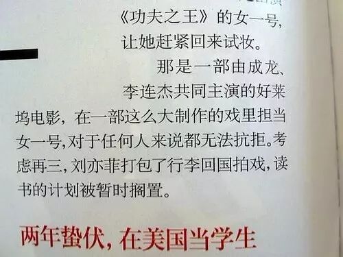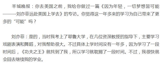 07年变成是去耶鲁学戏剧,刘亦菲也说过自己过了二试,因为《功夫之王》放弃了进入耶鲁的机会。