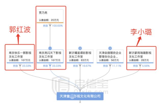 童X影视背后实际的控股人是贾乃亮和他的经纪人,各占33.3%的股份,李小璐占了5.56%。