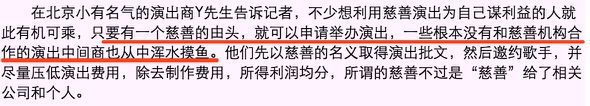 部分演出商瞧准了明星慈善义演这块大蛋糕,通过忽悠明星低价或免费参与,自己大赚差价。