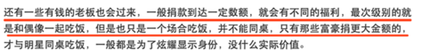 一些慈善晚宴还有个不成文的规定,企业家的捐款达到一定数额就会对应不同福利,可以有机会跟明星一起吃饭。