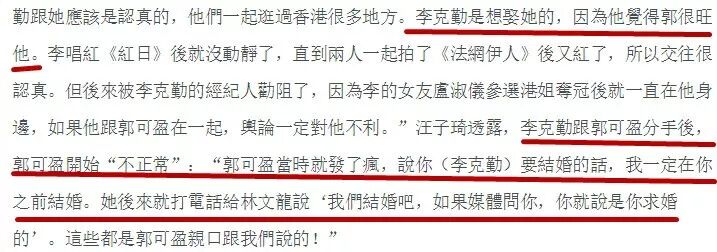 不过和郭可盈闹翻的经纪人汪子琦却爆料两人的关系可没这么纯洁,她证实两人当年确实一起过,李克勤甚至有娶她的打算。不过最后还是选择了女友卢淑仪,这让郭可盈大受打击,最后和林文龙结婚,也是为了一口气,要“赢”李克勤。