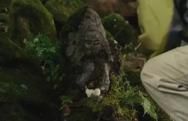 电影《哪啊哪啊神去村》中森林边的神明雕像,男主从旁边小河取水时掰了一半饭团放在雕像前表敬畏之心,后来他在树林里找走失的孩子,就受到了神明的指引。