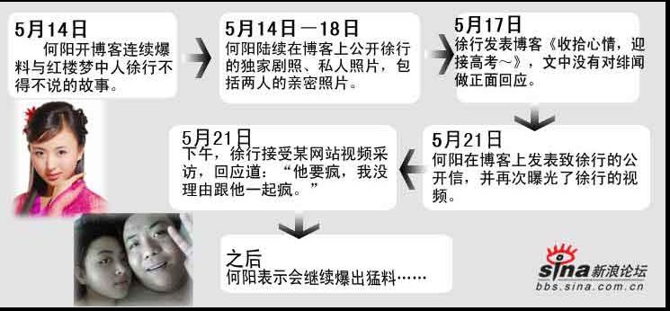 不过她引起最大的轰动,是在2007年选秀进行到5进3比赛后,一名叫何阳的男子开博客爆料他和徐行之间的感情纠葛。